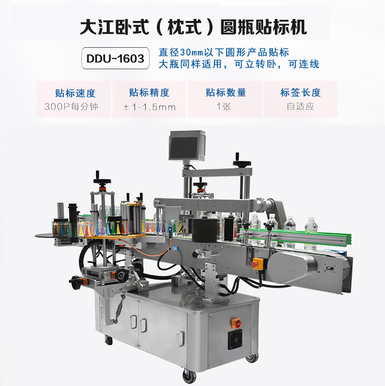 DDU-1603 立式圓瓶定位貼標(biāo)機 適用范圍:用途廣泛!主要適用于醫(yī)藥、日化、食品等行業(yè)的圓柱形包裝容器或小錐度的圓錐形包裝容器的單標(biāo)、雙標(biāo)自動定位貼標(biāo).該機拓展性強!可選配各類打印機完成在線實時打印,可單機使用,亦能連接生產(chǎn)線使用 主要性能結(jié)構(gòu)特點:1、中英文觸…